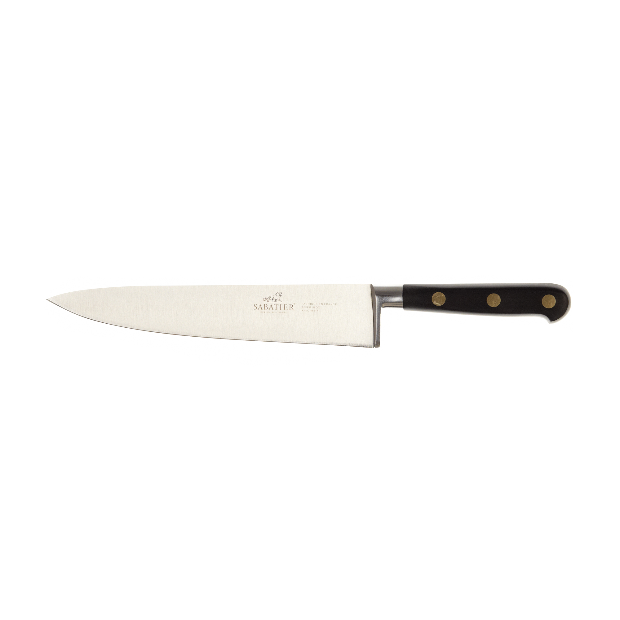 Lame inox 200 mm. manche ABS avec 3 rivets traversant. 100% forgé. Mitre rapportée en alu : économie et tradition.