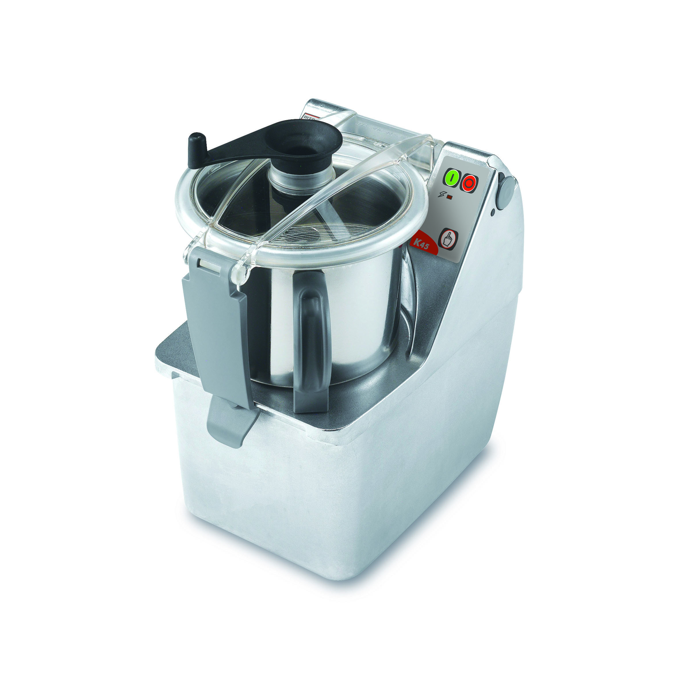 Fourni avec racleur/émulsionneur. Tableau de commande plat et étanche. Capacité de travail : de 100 g à 2 kg.