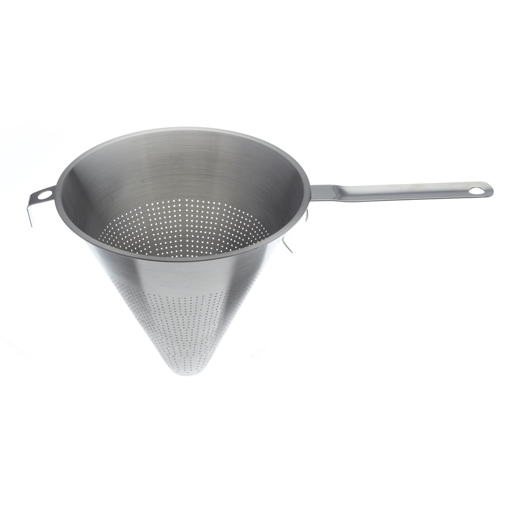 Perforation 1.5 mm. Gamme composée de différentes tailles dans un inox épais, très résistant à l'usage. Face à la queue, se trouve un crochet qui permet de poser le chinois dans une casserole. Il est possible de mettre le chinois sur les pieds des entonnoirs à piston afin d'éviter que le contenu soit renversé.Caractéristiques