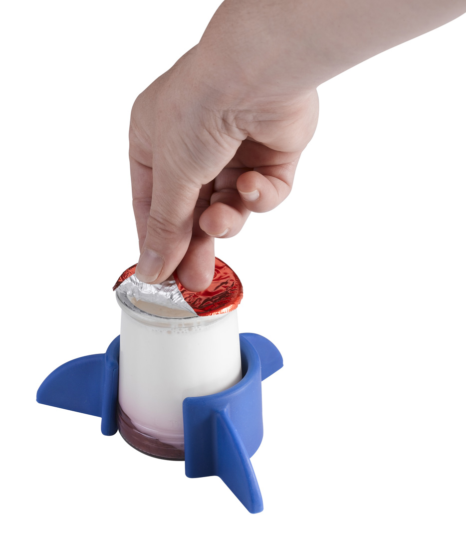 Support permettant d'éviter de renverser un yaourt, une compote ou un verre. Il permet aussi de manger plus facilement d'une seule main.