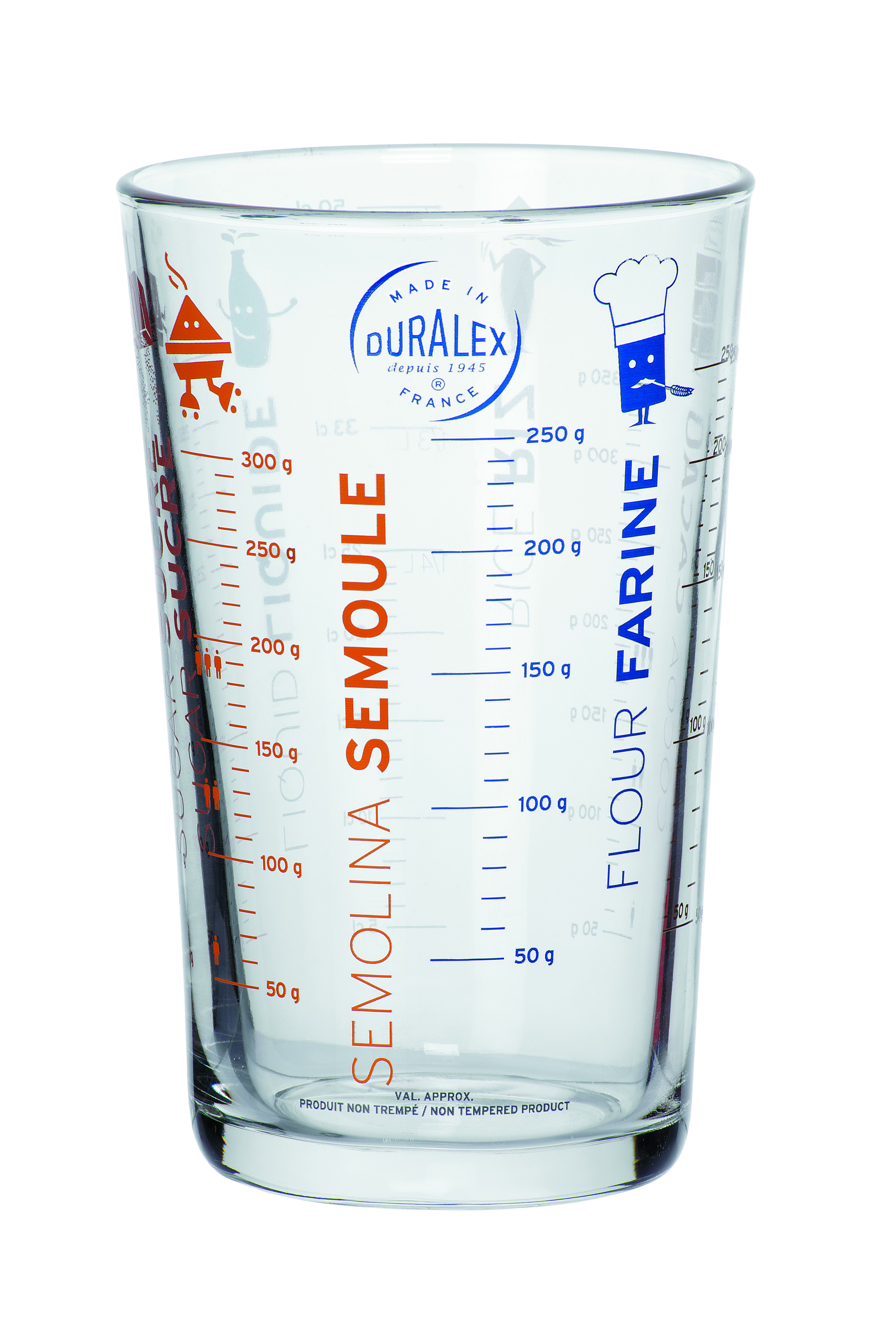 Verre doseur 56 cl comporte plusieurs graduations : liquide, sucre, semoule, farine, cacao et riz.
